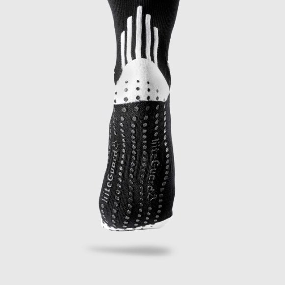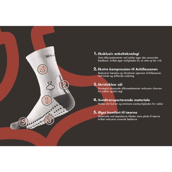 Strømpen har et strategisk placeret silikonemønster omkring anklens ledbånd. Silikoneknoppernes placering øger din sensoriske feedback, der styrker din evne til at stabilisere og øge din ledkontrol, for at undgå vrid og andre skader i foden.